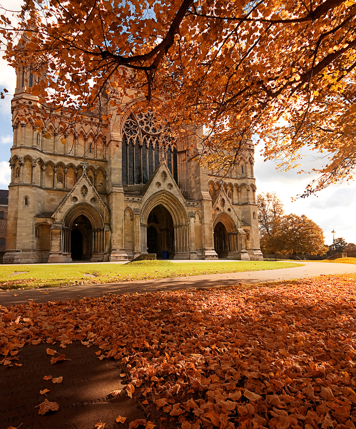 Golden leaves frame the historic façade of St Albans Cathedral as autumn settles gently across the landscape. The warm tones of the season echo the rich textures of the ancient stone, while a carpet of fallen leaves leads the eye towards the grand arched entrances. Soft sunlight filters through the branches above, creating a peaceful and nostalgic scene that captures the beauty of heritage and the changing seasons.
