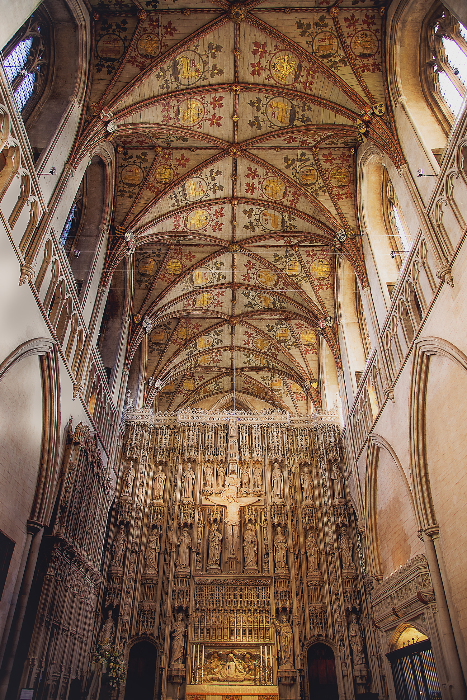 An awe inspiring view inside St Albans Cathedral showcasing the richly decorated vaulted ceiling and intricate Gothic altar below. Painted details stretch across the arches in warm tones of gold and red, drawing the eye toward the beautifully carved stone screen and central crucifix. The symmetry, craftsmanship and soft ambient light create a sense of depth, reverence and timeless beauty. This fine art photography poster captures the grandeur of historic architecture and sacred spaces, perfect for those who appreciate heritage interiors, ornate detail and classic British landmarks.