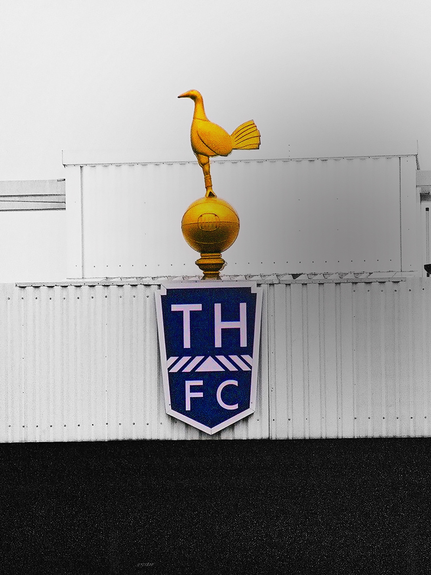 A minimalist fine art photograph of the iconic golden cockerel standing proudly above the crest of Tottenham Hotspur at White Hart Lane. With selective colour highlighting the famous symbol, this striking football poster captures the spirit of North London. Perfect as a modern sports photography print for fans and collectors of football art.