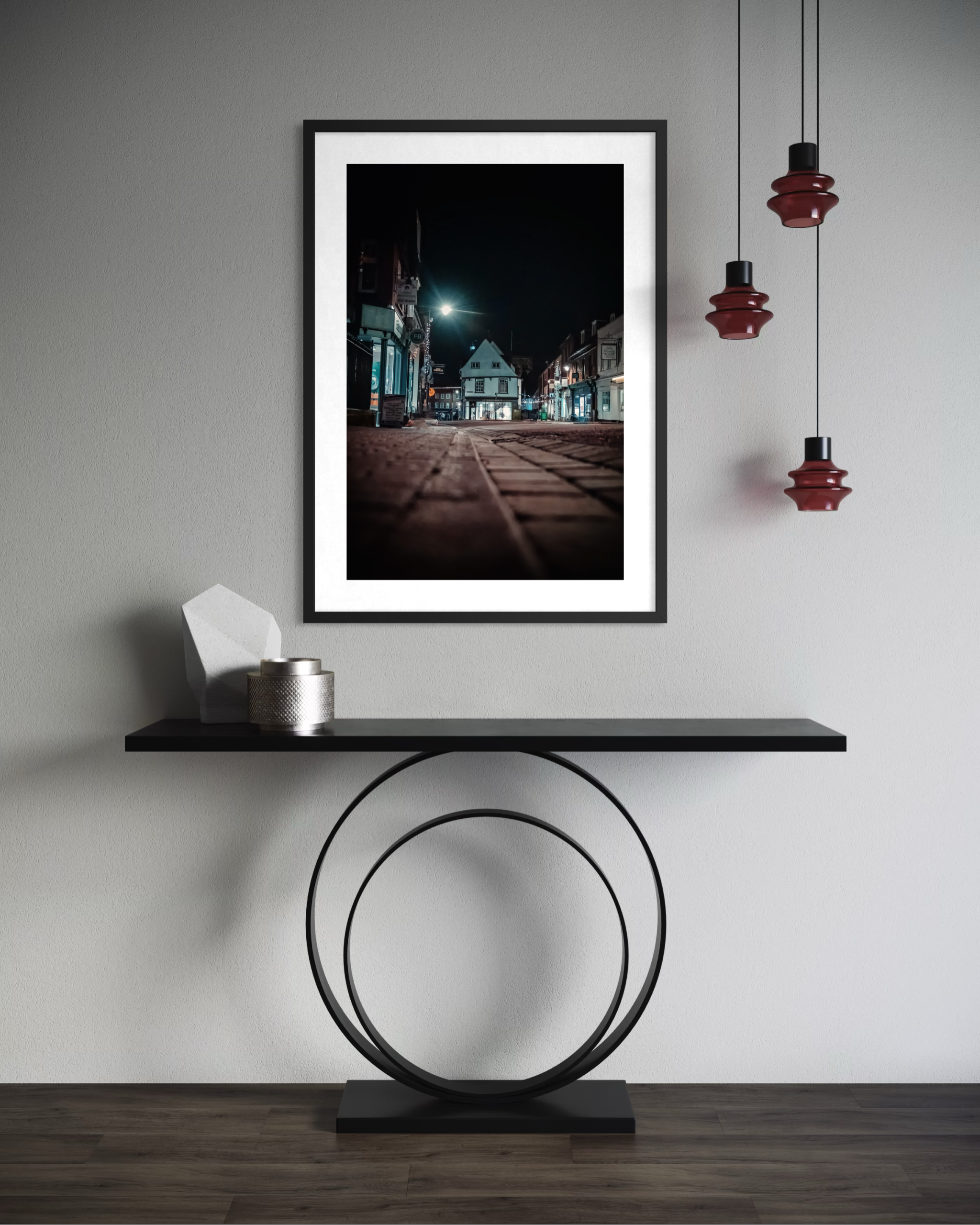 A cinematic low angle view across the cobbled ground of St Albans Market Place, where the historic architecture sits quietly under the glow of streetlights. The illuminated shopfront draws the eye through the scene while soft festive lights add warmth against the deep night sky. This fine art photograph captures the calm and character of St Albans after hours, blending texture, light and perspective to create a timeless piece of atmospheric urban wall art.