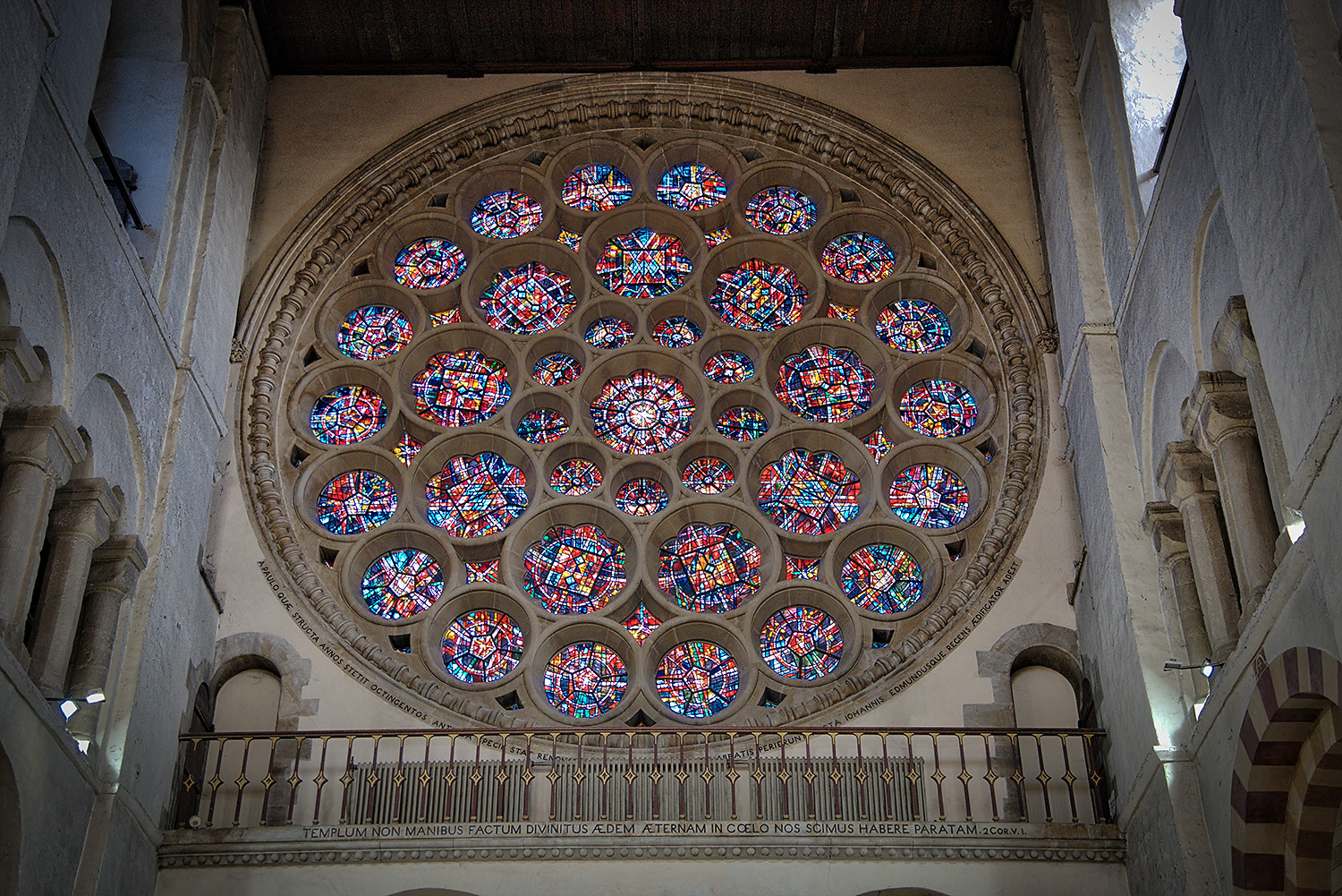 A stunning rose window fills the space with colour and intricate detail, its vibrant stained glass glowing against the ancient stonework of St Albans Cathedral. The circular design draws the eye inward, revealing layers of craftsmanship and history in every pane. Soft natural light enhances the rich tones, creating a striking and timeless focal point that celebrates the beauty of sacred architecture.